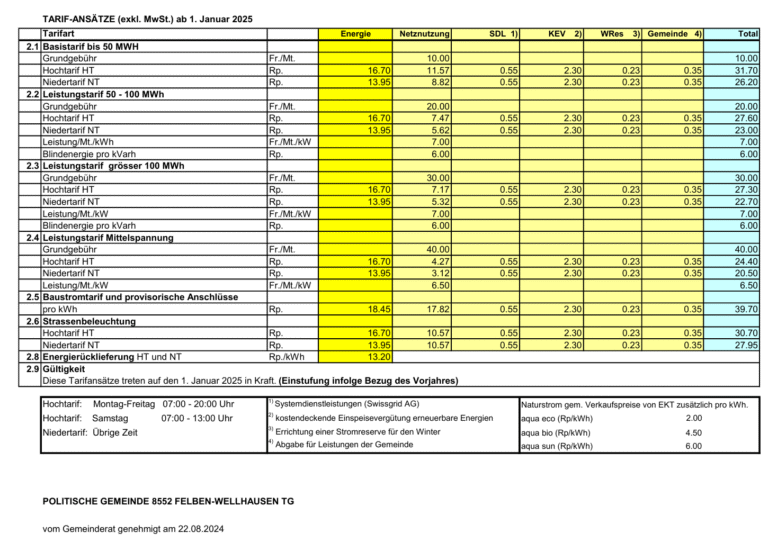 Die folgende Tabelle zeigt die Strompreise sowie die Einspeisevergütung 2025 in Felben-Wellhausen.