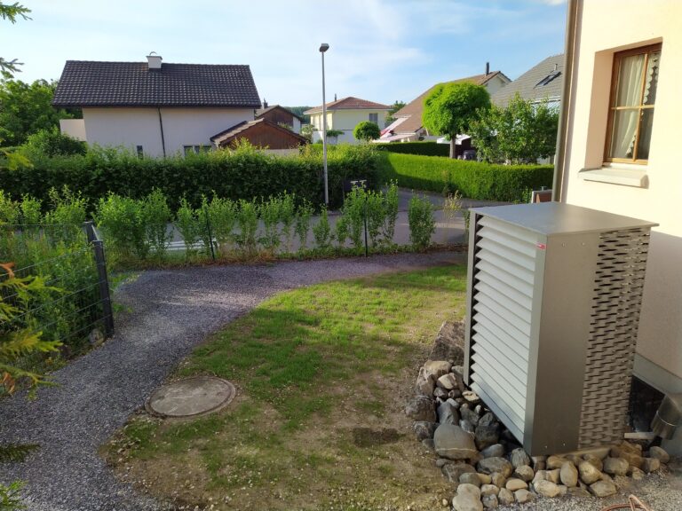 Unterschiedliche Arten von Wärmepumpen nutzen unterschiedliche Quellen von Umgebungswärme. Die aller häufigste Art der genutzten Umgebungswärme ist Luft – dies wird durch eine Luft/Wasser Wärmepumpe erreicht. D.h. die Wärme wird der Luft entnommen und auf das Heizwasser übertragen. Die folgenden zwei Bilder zeigen eine typische Installation (Felben-Wellhausen):