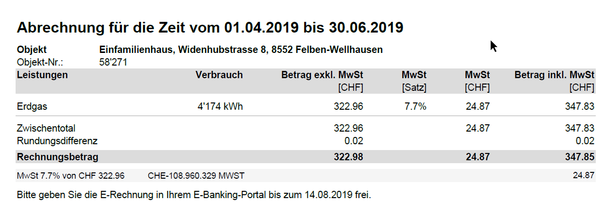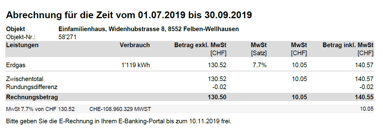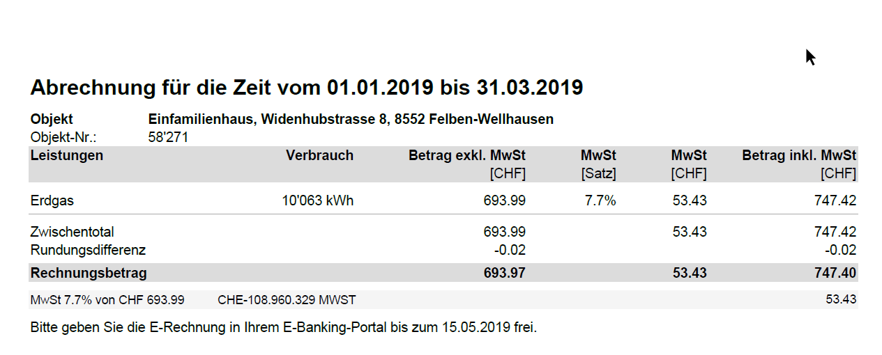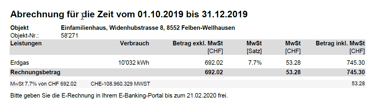 Die Beispiel-Luft/Wasserwärmepumpe in Felben-Wellhausen hat 2020 eine Gasheizung ersetzt. Der Energieverbrauch sowie die Kosten der Gasheizung von 2019 waren wie folgt:
