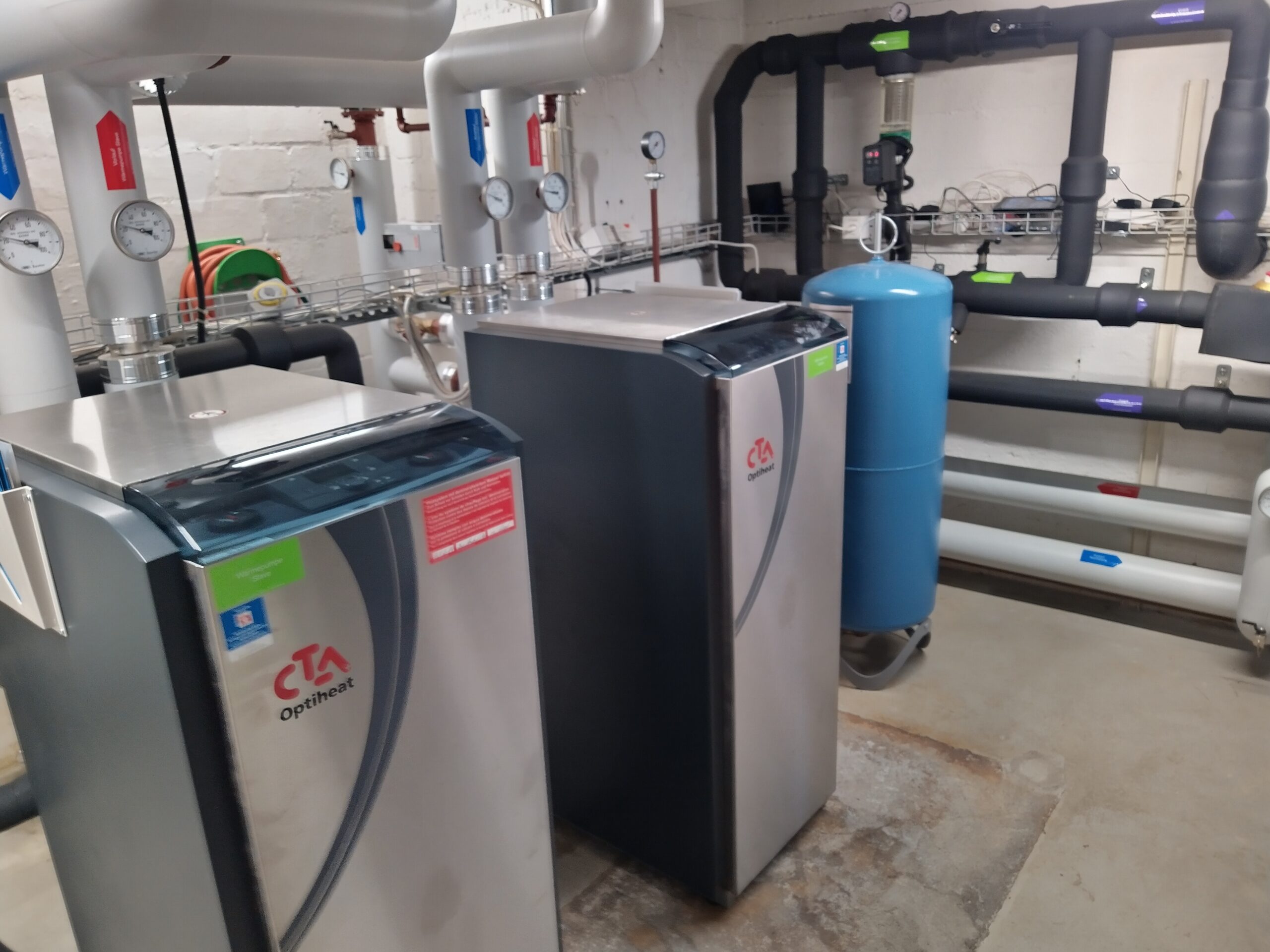 Das Bild unten zeigt eine Wasser/Wasser Wärmepumpeninstallation in Wettingen. Das Grundwasser wird hochgepumpt, zu den Wärempumpen geleitet, wo die Wärme entommen wird, und dann anschliessend wieder versickert. Das Grundwasser wird dabei minimal abgekühlt (< 2°C). Diese Installation kann aus einer kWh Strom ca. 5kWh Wärme erzeugen.